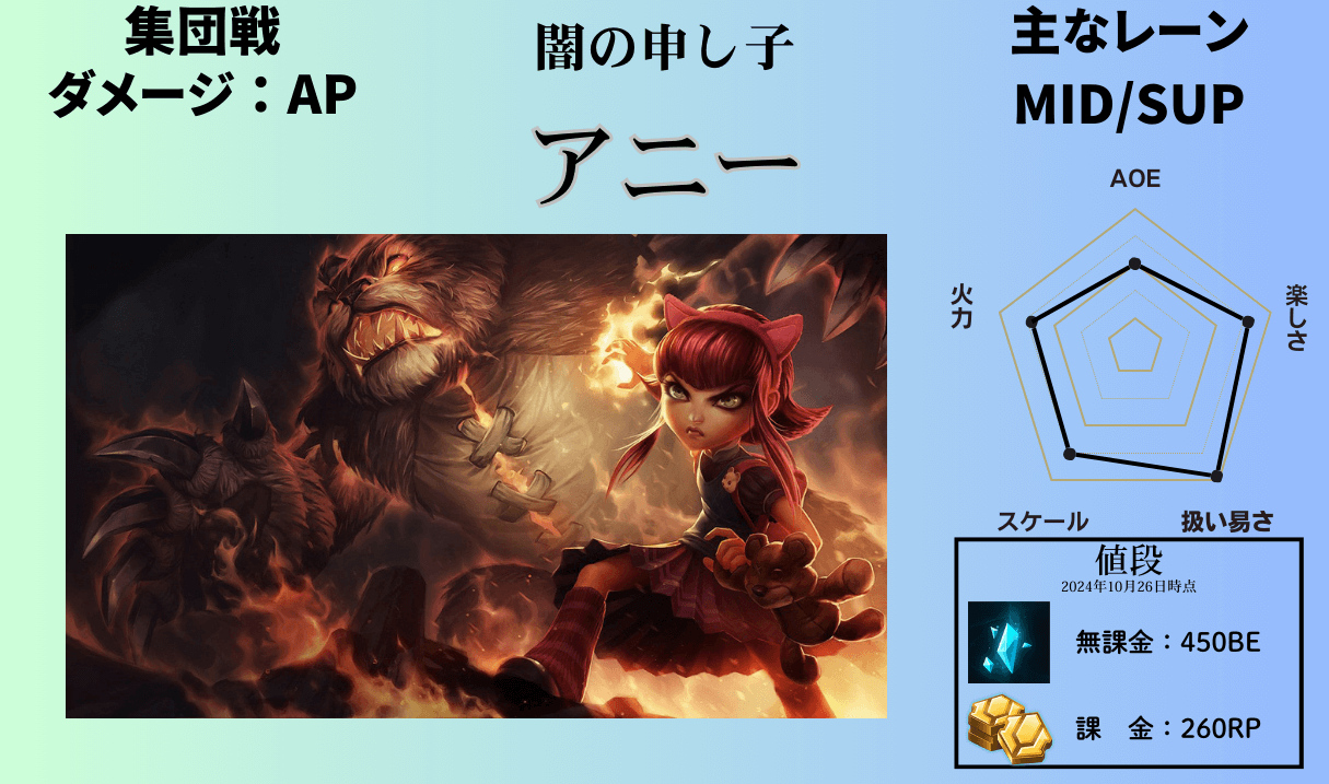 アニーはパッシブを貯めてCCと火力を一気に叩き込む分かり易いチャンピオンです。
